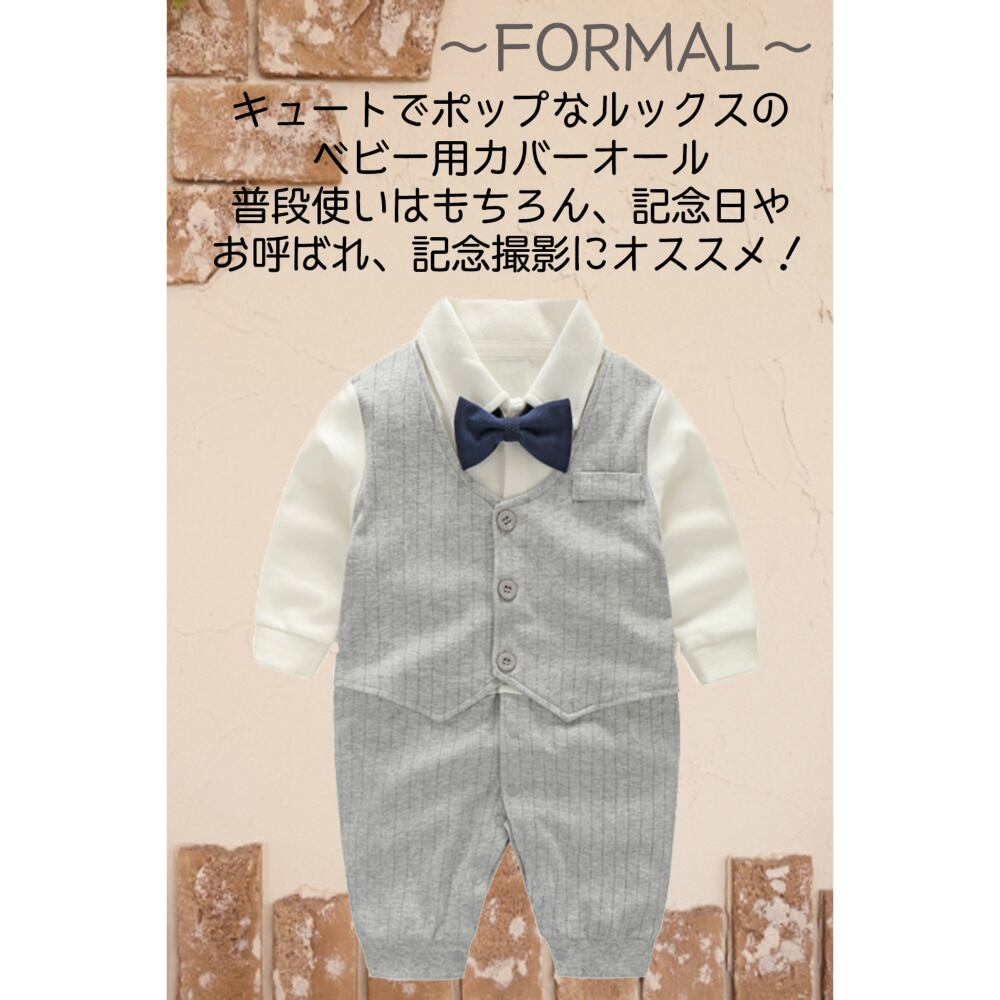キュートでポップなルックスのベビー用カバーオール ロングスリーブタイプなので春、秋、冬の結婚式、入学式、卒園式などのフォーマルシーンに対応します