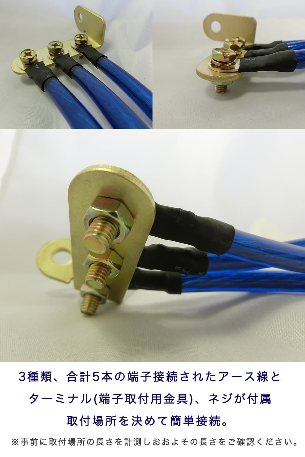 3種類、合計5本の端子接続されたアース線とターミナル(端子取付用金具)、ネジが付属しているので、取付場所を決めて簡単接続。※事前に取付場所の長さを計測しおおよその長さをご確認ください。