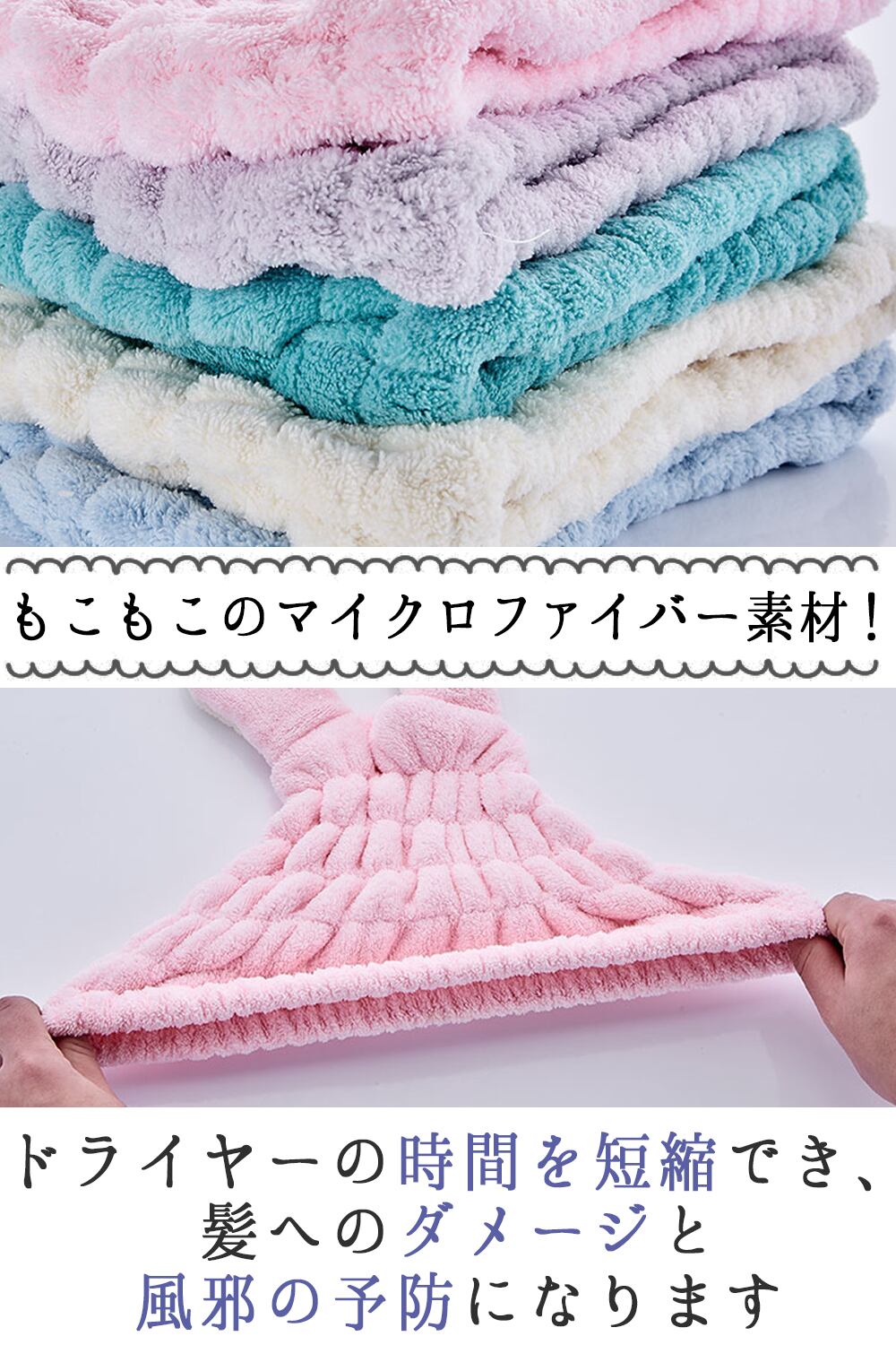 お風呂上がりやプールの後に、簡単タオルドライできるヘアキャップです。