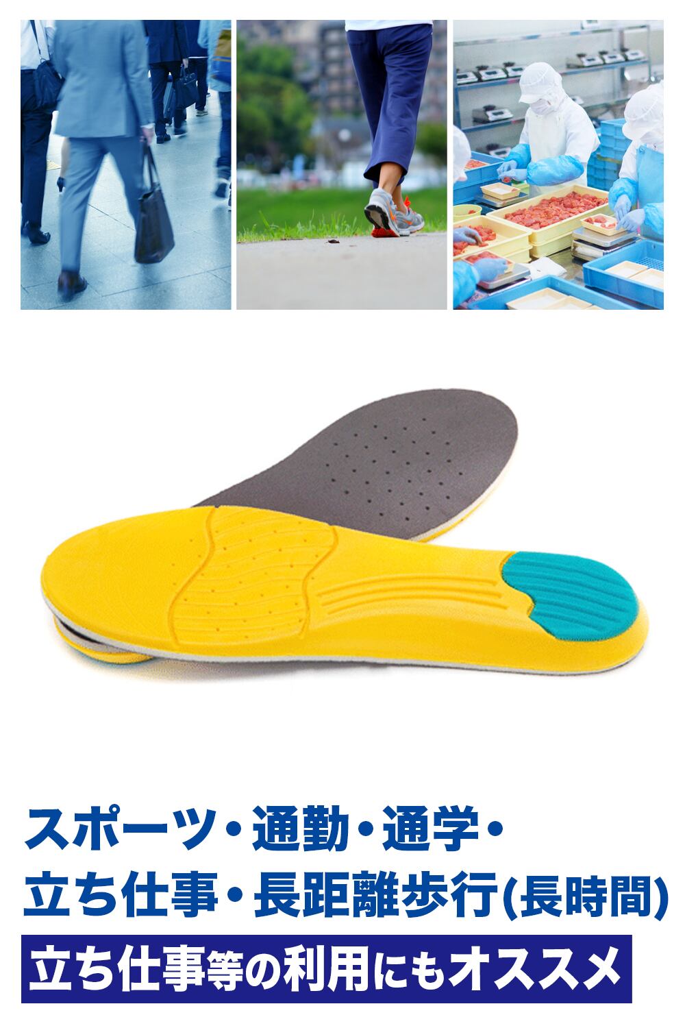 厚みのある衝撃吸収クッションインソールとして、くつの中敷きとしてセットし、ひざやかかとを含む脚全体の衝撃吸収、衝撃緩和にご利用ください.。注意 【推奨利用シーンなど】