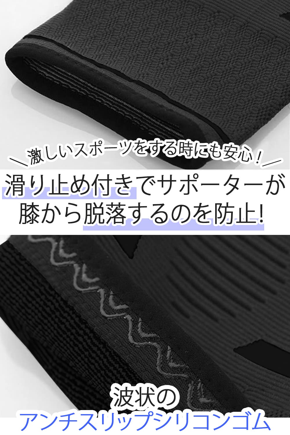 波状のアンチスリップシリコンゴムは、膝からサポーターが脱落するのを防止することができ、激しいスポーツをする時にも安心できる膝保護サポーターです。