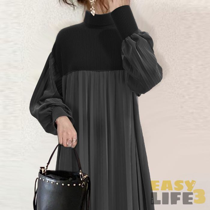ロング ワンピース 春 秋 冬 レディース きれいめ 長袖 マキシワンピース 切り替え プリーツワンピース マキシ丈 ロングワンピース ニット フリルドレス 体型カバー カジュアル オフィス OL おしゃれ ハイネック 大人 可愛い パフスリーブ ゆったり 通勤 20代 30代 40代 50代