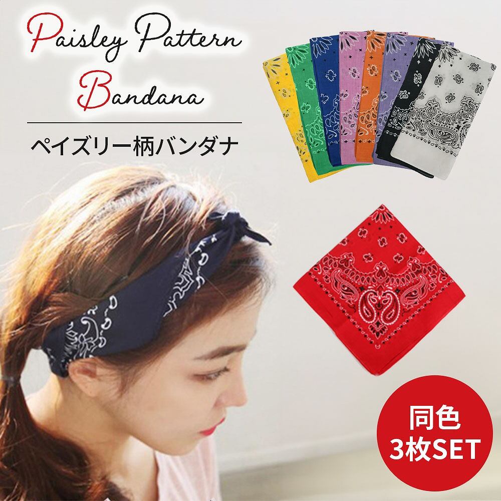 ペイズリー柄バンダナ3枚セット おしゃれ トレンド 男女兼用 コットン100% 9色展開 レッド イエロー グリーン ネイビー ピンク オレンジ シンプル デザイン 人気