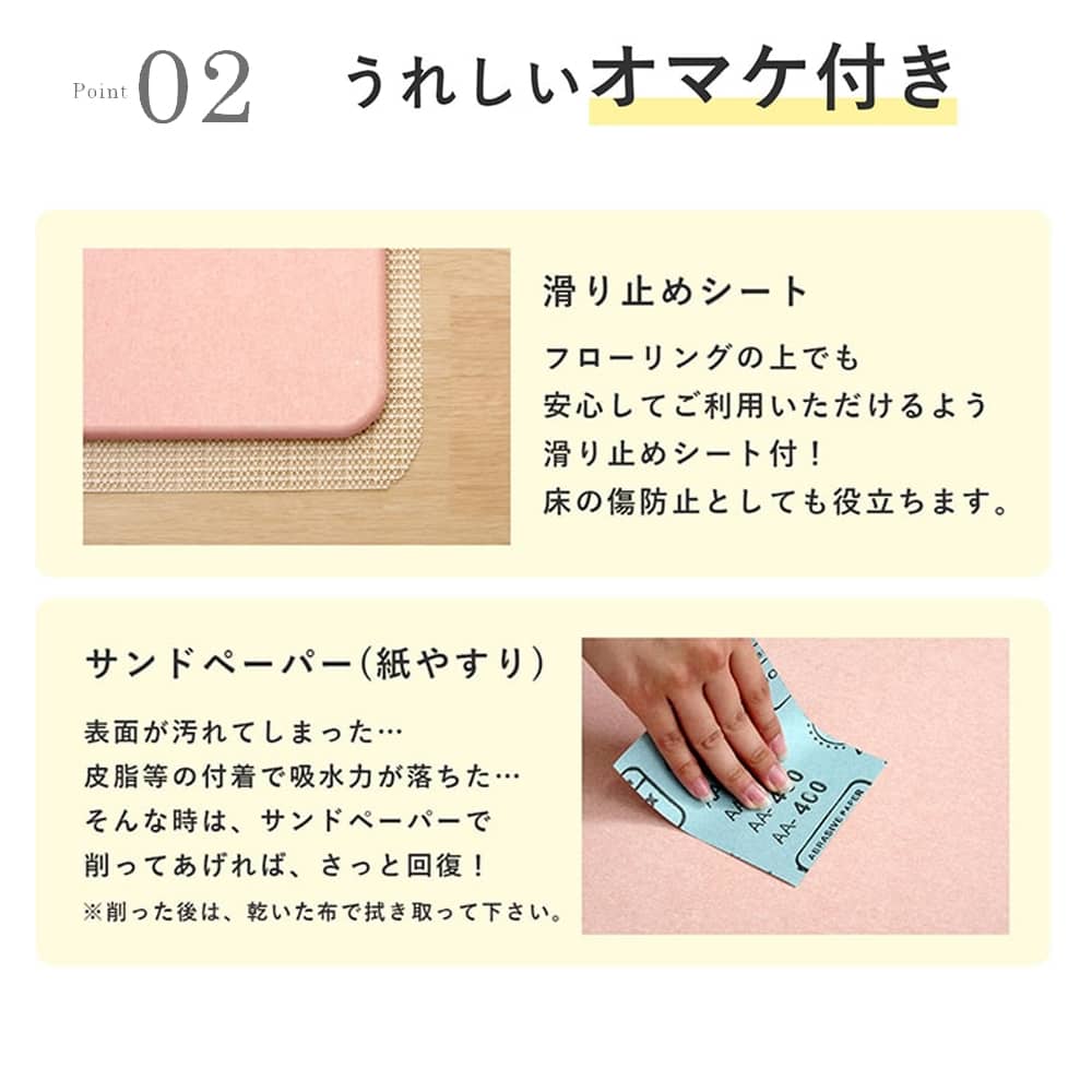 お手入れ:可特徴 【珪藻土】珪藻土バスマットは、「呼吸する土」とも呼ばれる天然素材を採用しており、吸湿・放湿を行う「調湿」性能がある。水分を自動的に吸ったり出したりするので、清潔感と爽快感が得らえる。