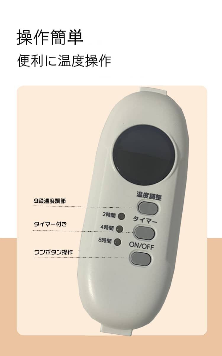 【9段階の選べる温度調整】 温度調整は9段階! 手元のコントローラーで簡単調節。約20℃〜約60℃まで、細かい調整が可能。気温や体質に合った温度に調節できます。※使用環境により変動いたします。 ※発熱機部分の温度であり、表面温度とは数値が異なる場合がございます。