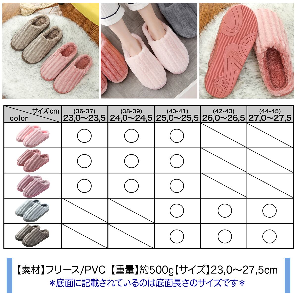 商品仕様品番 UC-316カラー ピンク/レッド/パープル/ブルー/ブラウンサイズ 23.0cm〜27.5cm素材 フリース/PVC重量 約500g生産国 中国商品説明 素足でもしっかりあったかい!