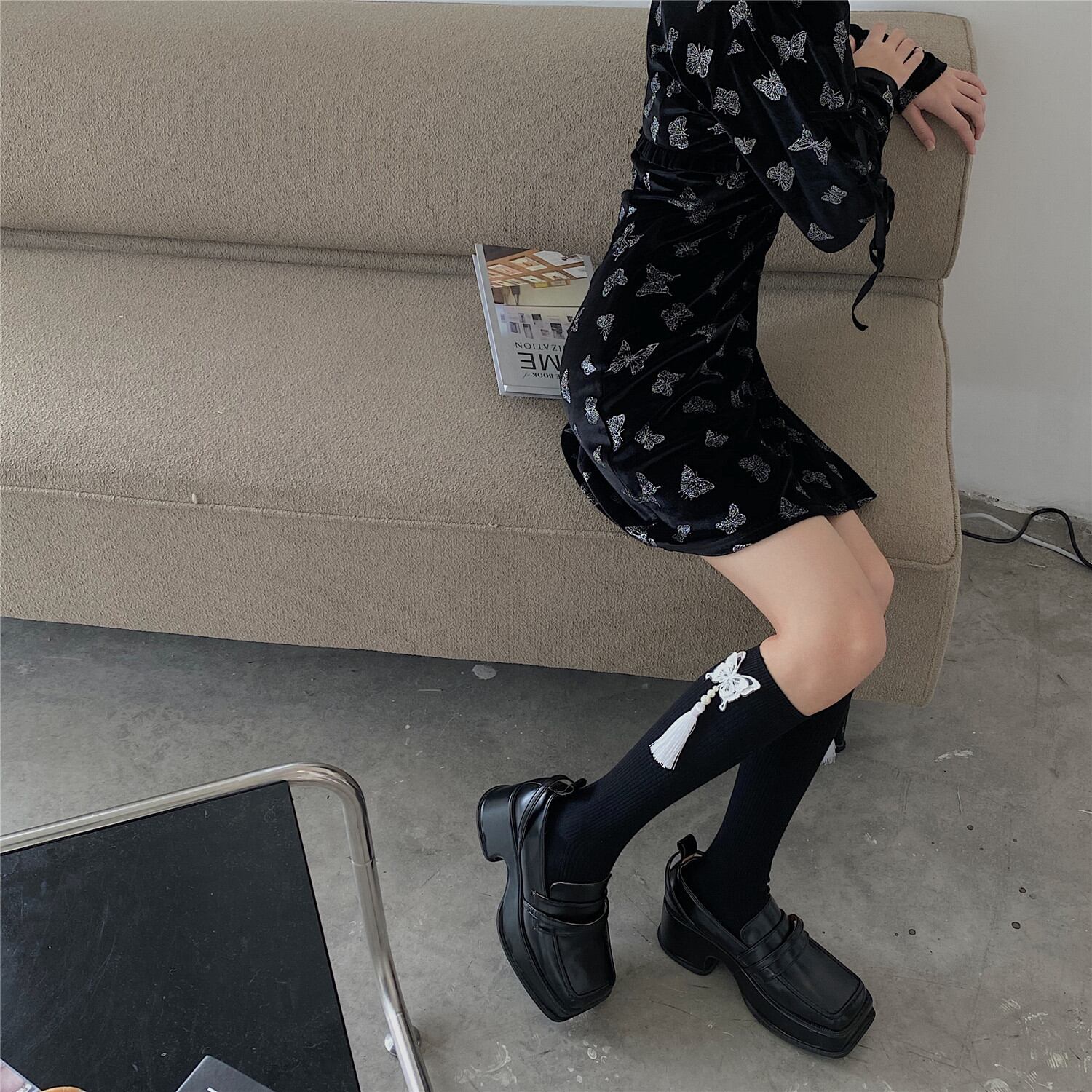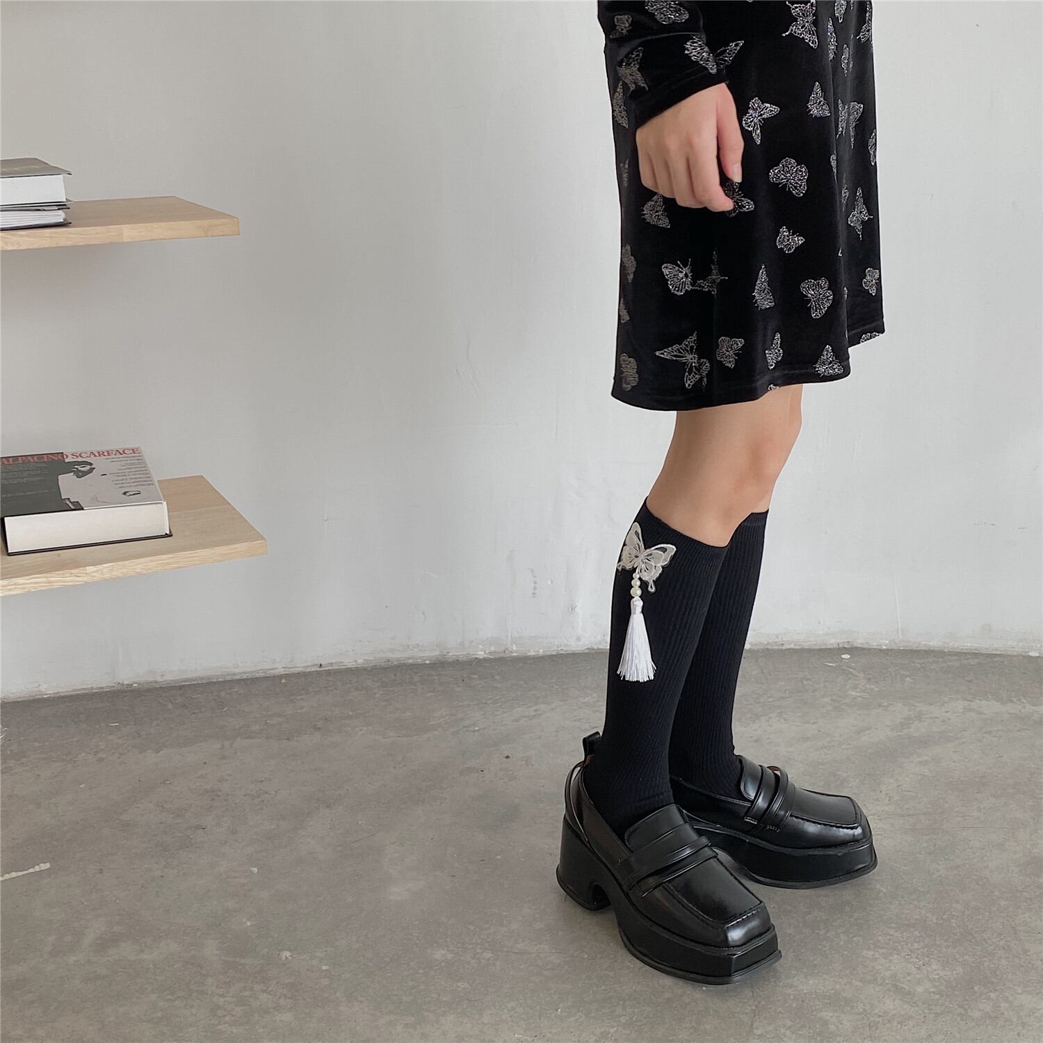 秋冬 バタフライ パール カーフ ソックス フリンジ付き二本針コットン ミッドカーフ ソックス 暖かい ホワイト ブラック