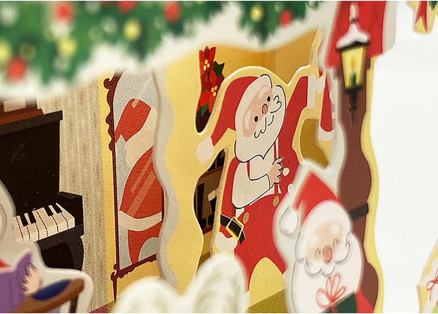 おもちゃの工房や書斎、キッチン、屋根裏の寝室など、サンタたちの暮らしを3層構造で立体的に表現しました。