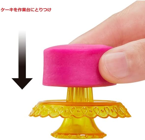 リアルなケーキ作りのために、お子さまは2種類の粘土(ピンクとブルー)を使って、オーブンに入れ、レバーを引いてケーキが盛り上がるのを見ることができます。そして、焼きあがったケーキを作業台にのせ、デコレーションやトッピングをすることで、ケーキのデコレーションも楽しむことができます。
