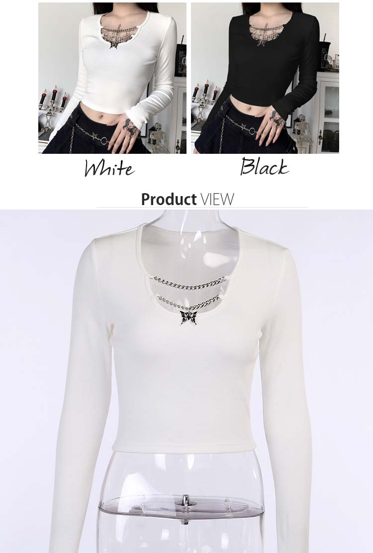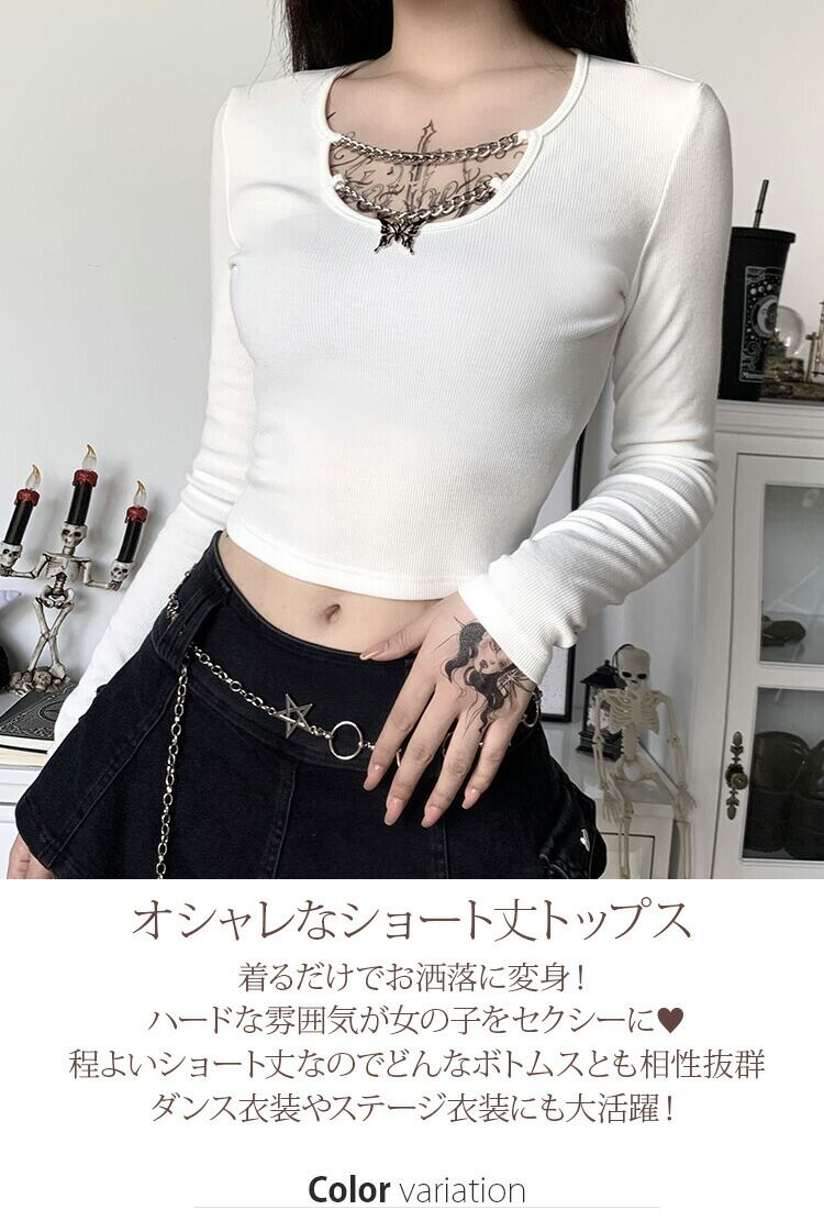 カットソー トップス ショート丈 長袖 チェーン 蝶 へそ出し ストリート ヒップホップ 原宿 派手 ハード系 ロック コスプレ ハロウィン セクシー 肌みせ