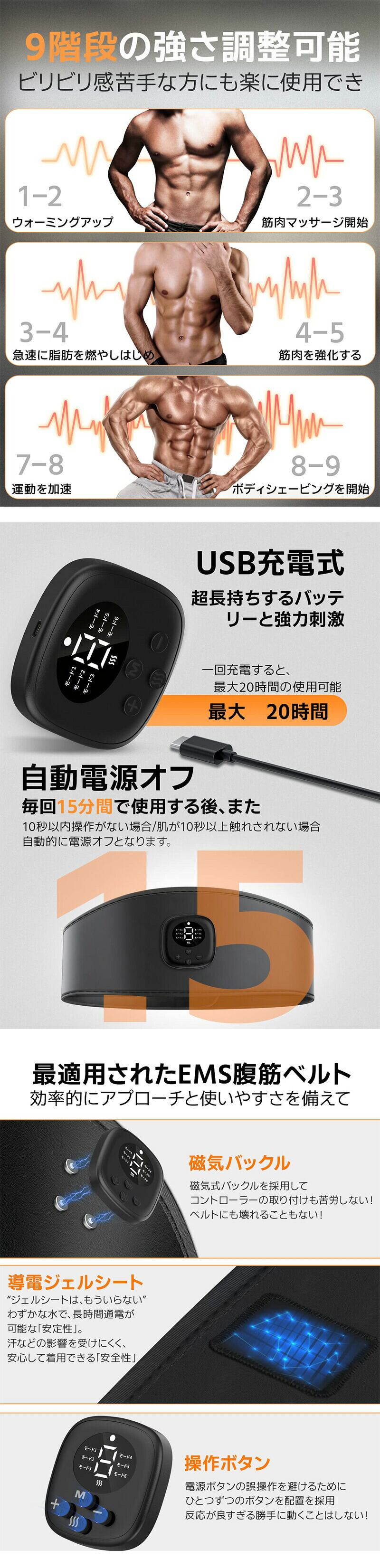 腹筋ベルトは革新的なEMS技術採用して、emsは弱電流で、電気の刺激で直接に神経まで運動信号を発送して、筋肉を自主的に運動させる、より短い時間で最高の効率を達成できます。わずか15分腹筋パッド、エクササイズはジョギング2500m、筋トレ鍛え30分または自由水泳30分に相当。「ボディービル」理想の筋肉の形に近づけるように自身を変えろ!