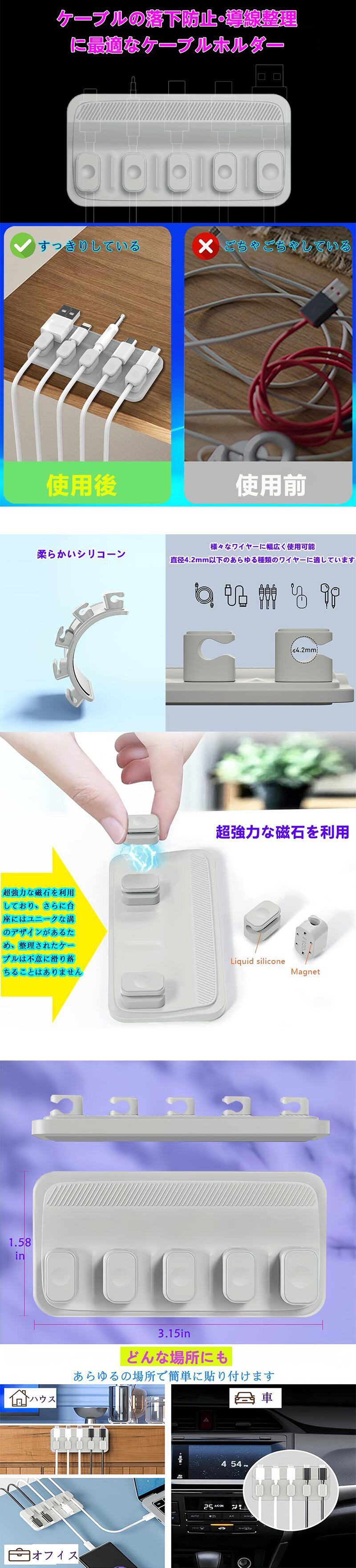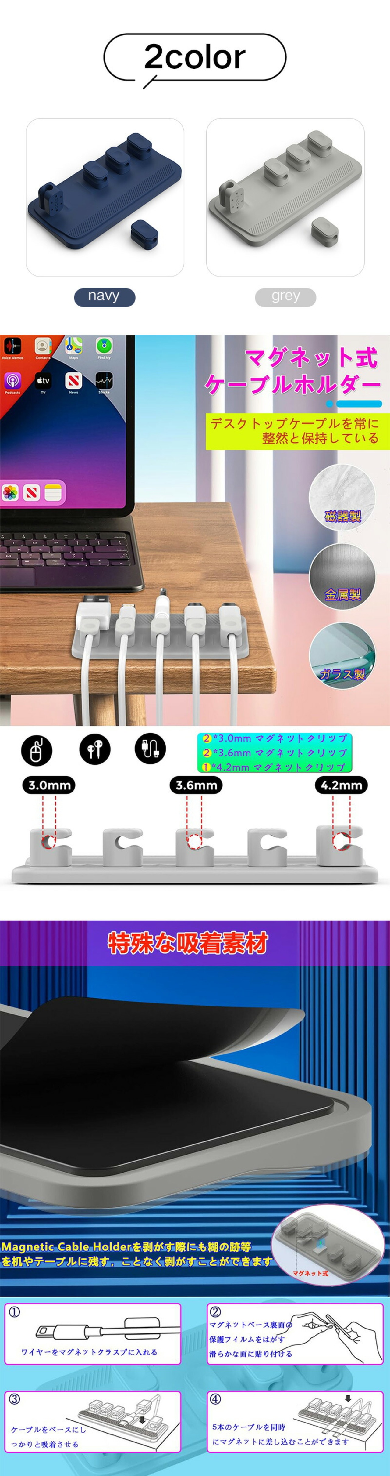 マグネット式 ケーブルクリップ 配線止め 配線整理 デスク周り 強力粘着収納 卓上 車内 ケーブルオーガナイザー 便利グッズ ライトニングケーブル