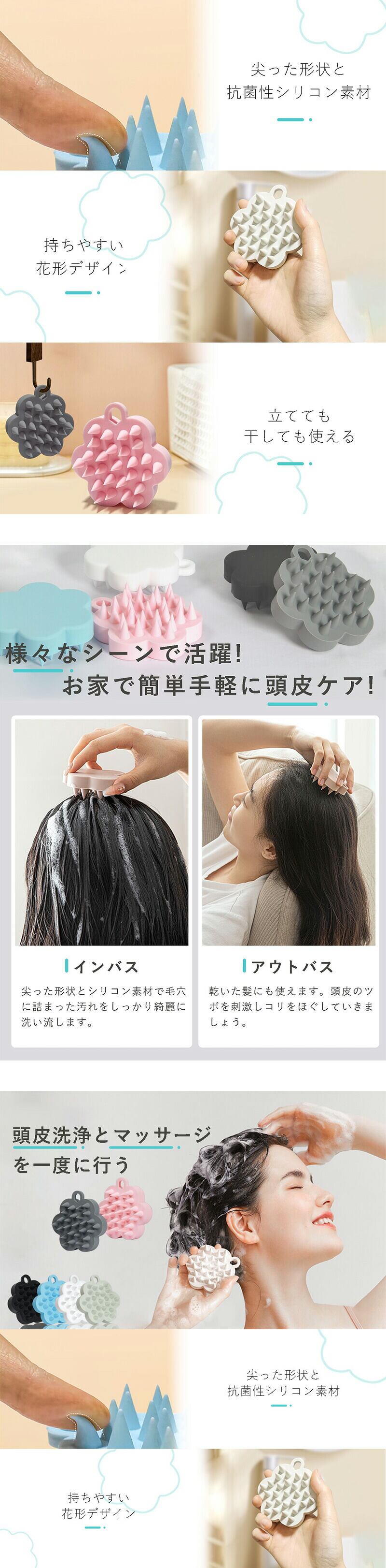 【様々なシーンで活躍】「インバス・アウトバス」どちらでも使えるので、好きなタイミングでマッサージできます。女性の方は勿論、お子様や男性、また年齢関係なくご愛用いただけるシャンプーブラシです。乾いた髪にも使えます。頭皮のツボを刺激しコリをほぐしていきましょう。リラックスしながら血行促進!ゆっくりと押し当て心地良い刺激を行うことで、リフトアップ効果や抜け毛予防につながります。商品詳細【詳細】 【毛髪診断士推奨】尖った形状と抗菌性シリコン素材で毛穴に詰まった汚れをしっかり綺麗に洗い流します。ニオイやフケを効果的に除去します!毛穴の詰まり、頭皮の臭い、髪の毛のハリがない、そんなお悩みのある方におススメです。