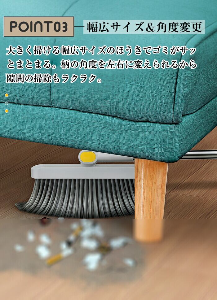 【180°角度調節可能ほうき】最新型回転式ほうき、180°角度調節可能、狭い空間の掃除にも便利、ソファーの下、角のところ、簡単に掃除できます。掃除後ちりとりに付いているくしを利用して、手を汚さずにほうきに付いた髪の毛やホコりなどきれいに落とします。