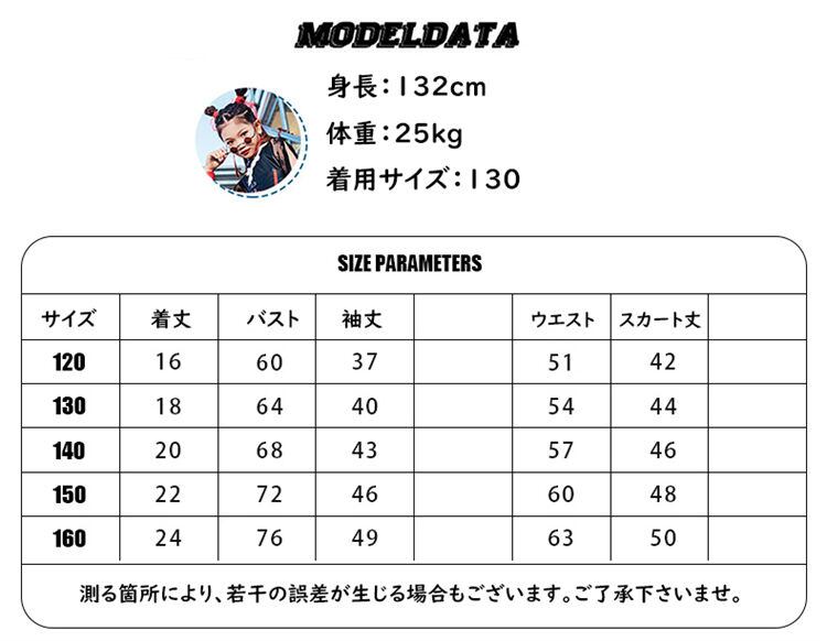 ※測る箇所により、若干の誤差が生じる場合もございます。ご了承下さいませ。サイズ 身長CM 体重KG120 120-125 12.5~22130 125-135 22.5~27140 135-145 27.5~32150 145-155 32.5~37160 155-160 37.5~50注意 ※モデル着用画像は撮影環境により実物の色と異なって見える場合がございます。