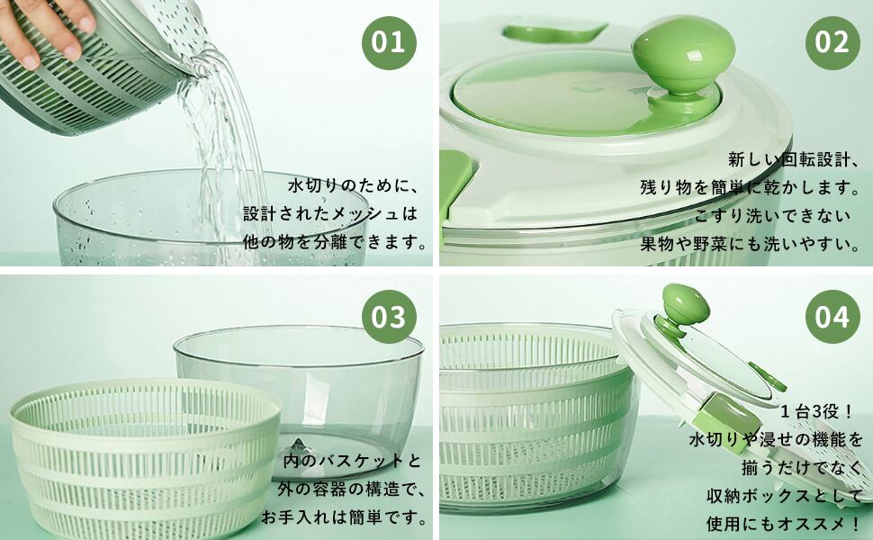 【組み合わせで4Way活用】ひとつ持っているだけで、いろいろな用途があります。 水切り機能付き、果物や野菜を浸せ、収納ボックスとして使用も最適です。サラダスピナーだけでなく、ザルやボウル・保存容器として使うことができる優れたアイテムです。組み合わせ方次第で4通りの使い方が可能。 1.サラダスピナーで 2.ボウルのみで(切った野菜を入れたり、卵を溶いたり) 3.ザルのみ(麺類やフルーツなどのちょっとした水切りに) 4.ザルとボウル(野菜を水にさらしたり、麺を冷やす時にも)