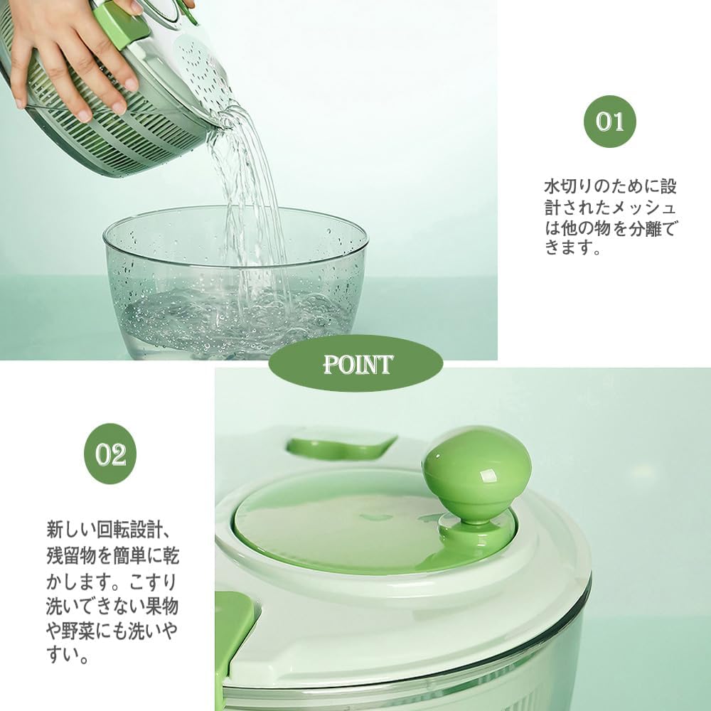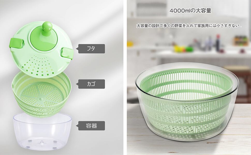 【こだわり抜いたデザイン】・PP+PS素材を採用して、無毒無害、安心に使用することができます。 ・4000mlの大容量の設計で多くの野菜を入れて、家族用には小さすぎません。 ・左右どちらにも回せるので、利き手を問わず誰でも使えます。 ・蓋の両方はロック機能付きのため安心して回せます。 ・底面には幅広な滑り止めが付いているので、調理台が濡れていても安定性抜群です。ブレーキボタンで高速の回転を止めても滑りにくくできています。