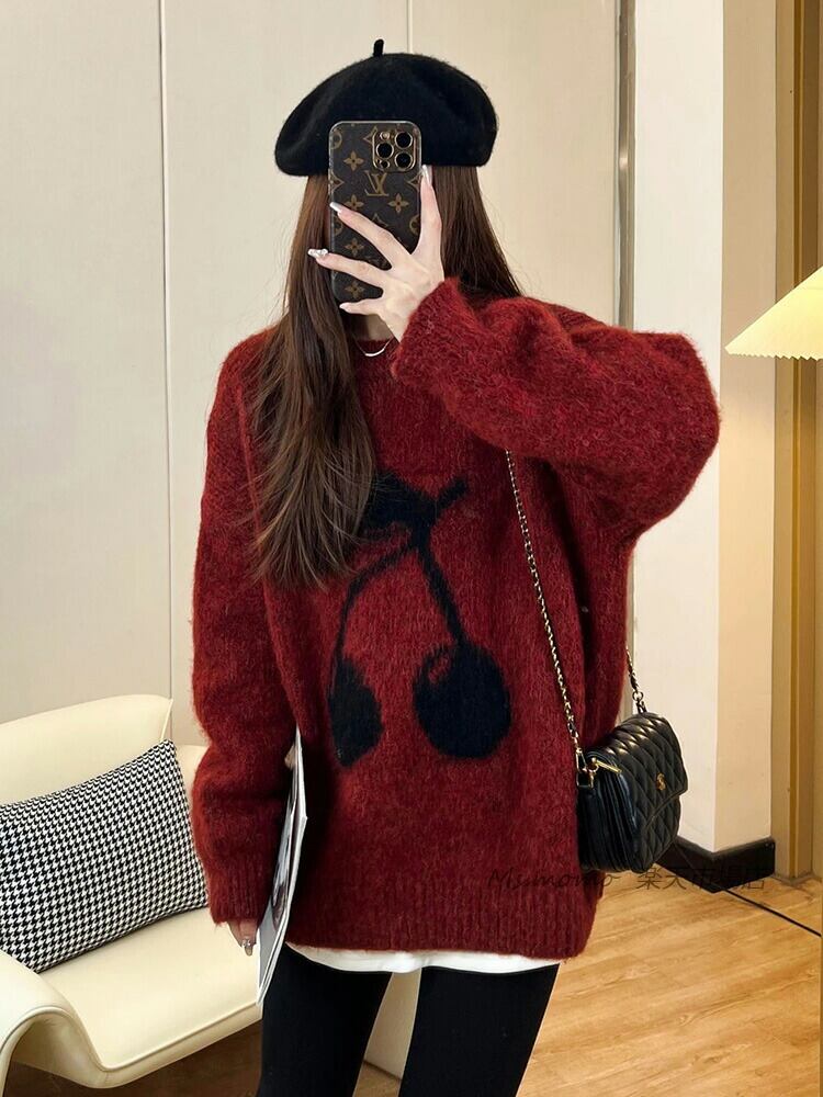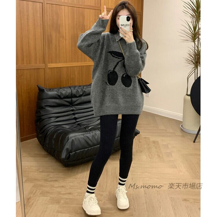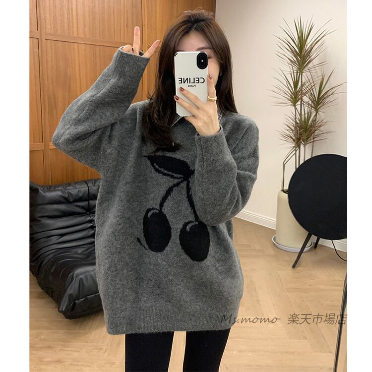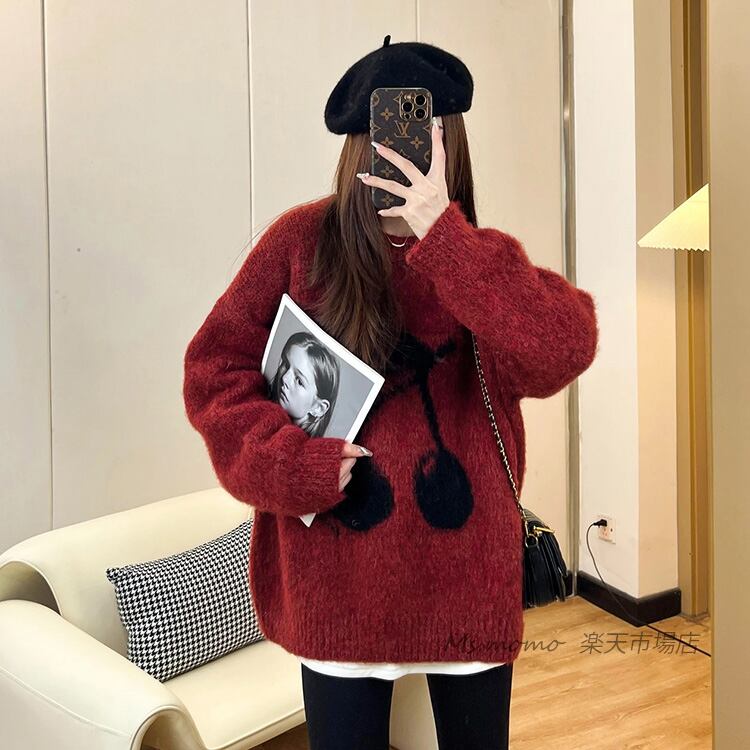 連携キーワード:ニットトップス レディース 春秋冬 40代 長袖ニットセーター チェリー柄 ミディアム丈セーター ゆったりプルオーバー オシャレ韓国風 大人ニットインナー 50代 30代