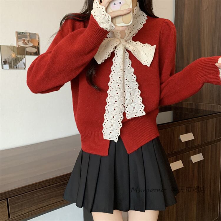 連携キーワード:ニットカーディガン レディース 春秋冬 40代 長袖セーター レースリボンネック Vネックニットカーディガン ショット丈セーター ゆったりプルオーバー オシャレ韓国風 大人ニットアウター 50代 30代