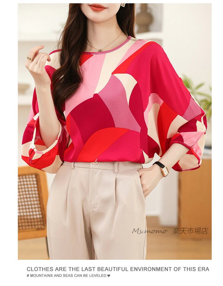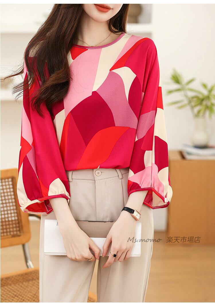 連携キーワード:ブラウス レディース 七分袖ブラウス 春夏秋 オフィスブラウス 配色プリント オシャレブラウス パフスリーブ トップス 韓国風 大人 通勤OL ゆったりシャツインナー 40代 30代 50代