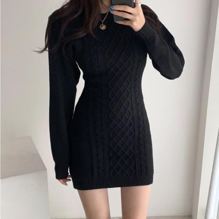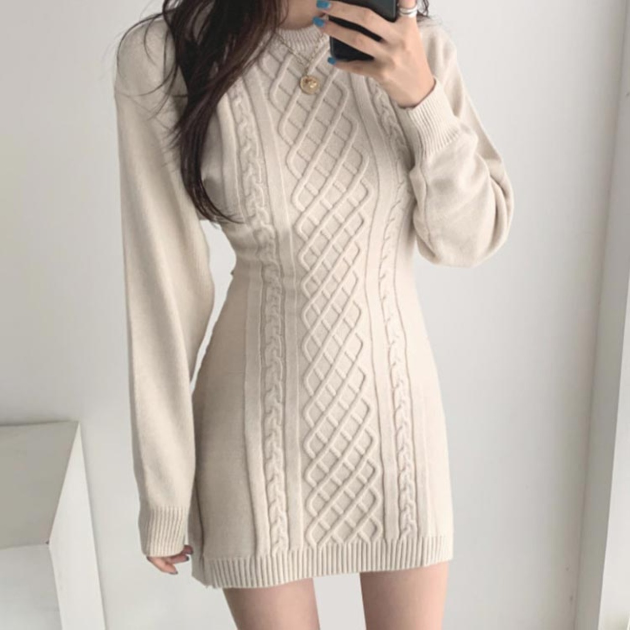 ケーブルニットワンピース 背中開けトレンド おしゃれ ニットワンピース 韓国 背中見せ タイトレディースファッション ワンピース