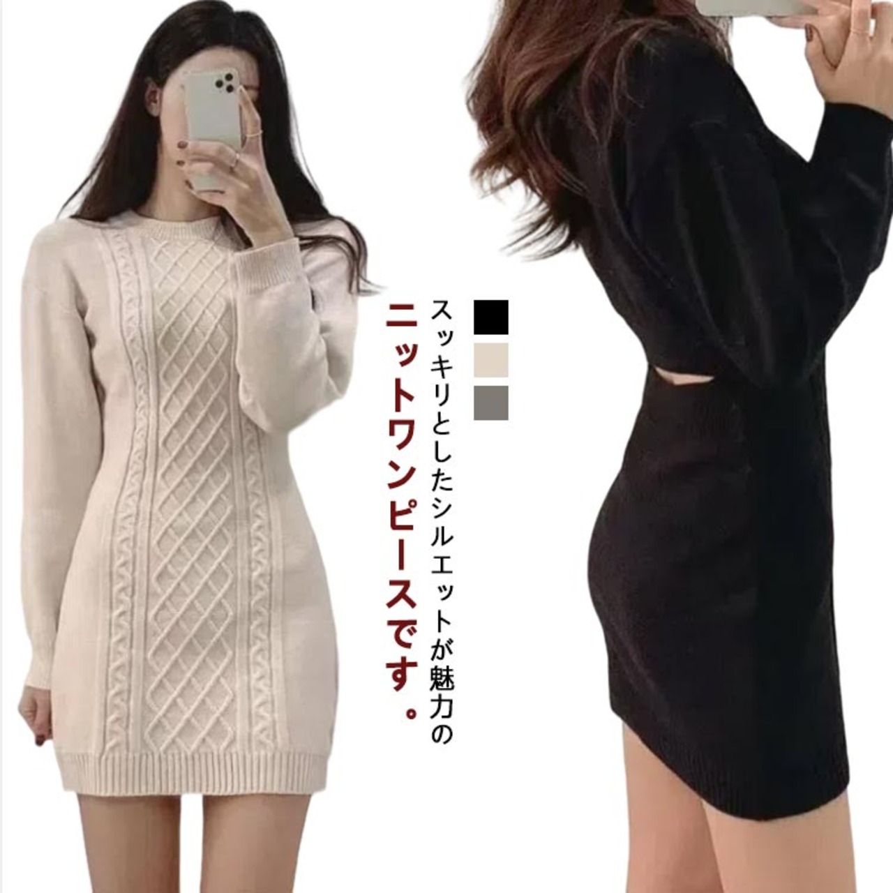 ケーブルニットワンピース 背中開けトレワンピース 続々登場カラー: ブラック ベージュ グレー