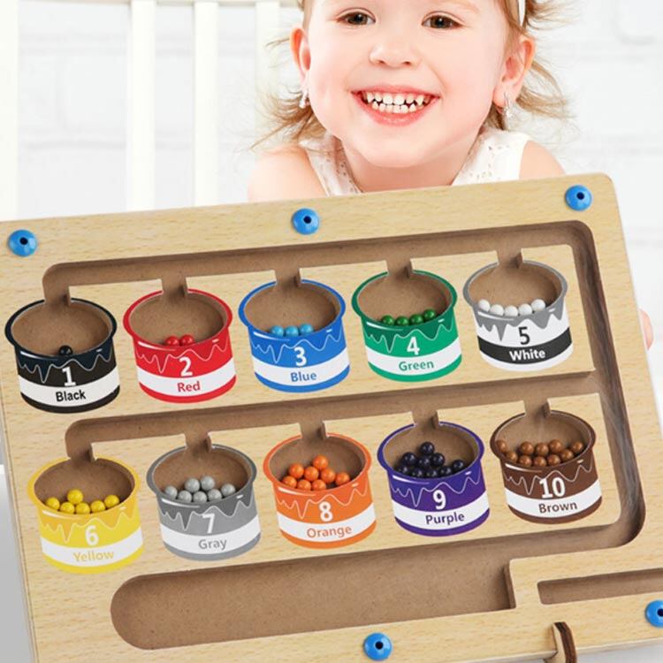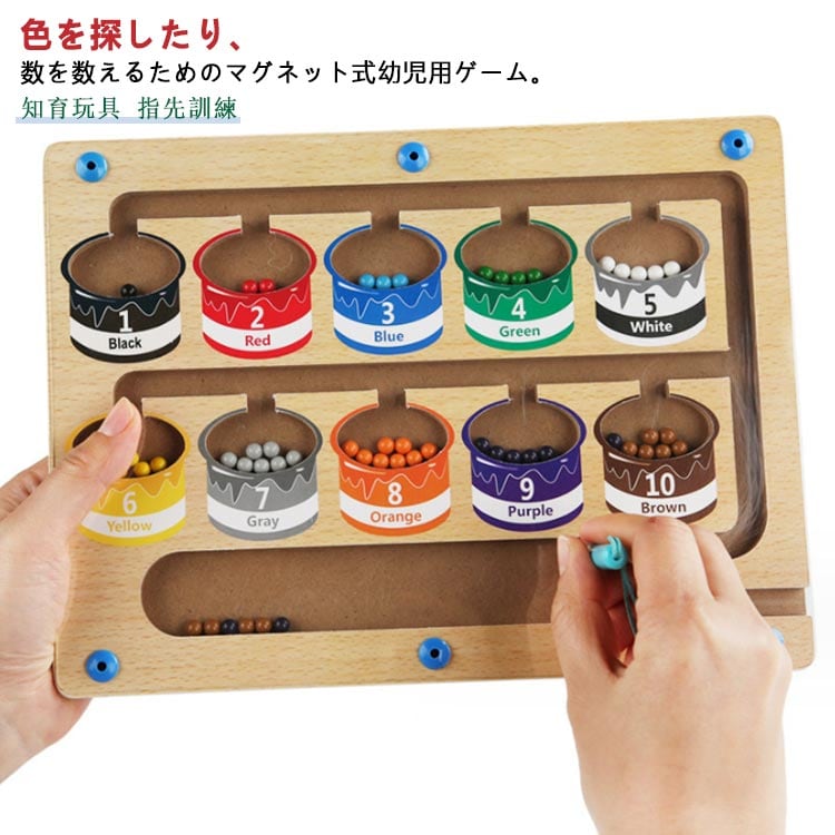 木のおもちゃの迷路には、1〜10の数字を表す10個の「ペイントポット」と、お子様が数を数えられるように10色の明るい色のマグネットビーズが組み込まれています。3、4、5、6、7歳のお子様への知育おもちゃ的な贈り物として最適です。