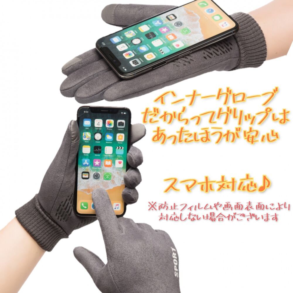 ゲレンデの新常識♪ グローブの下に嵌めるインナーグローブ! 洗濯しづらいメイングローブの保護、 スマホ操作やちょっとしたメイングローブを 外すときの防寒として、 インナーグローブとしては珍しいグリップ付きと、 着用したままタッチパネル対応の 機能性インナーグローブ! ※防止フィルムや画面表面により 対応しない場合がございます。 ※人差し指のみの対応です。 締付袖口なので袖から風を通さない! どんなに上質素材を使っていても 袖口からスースー風が入っては意味がありません。 伸縮性があって男女問わないサイズフリー。 撥水ではありませんが、 防水仕様なので雪水がグローブ内部に 侵入はしてきません♪ 表生地、裏生地共に触り心地なめらかで、 心地よい装着感を得られます。 スキー、バイクツーリング、アウトドア にはもちろん通勤通学の防寒手袋としても、 この冬1組あって損はない♪ 伸縮性素材 裏ボア 袖口 7cm 全長16.5cm ※平置き採寸値 カラー ブラック グレー からお選び下さい。