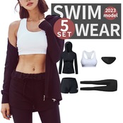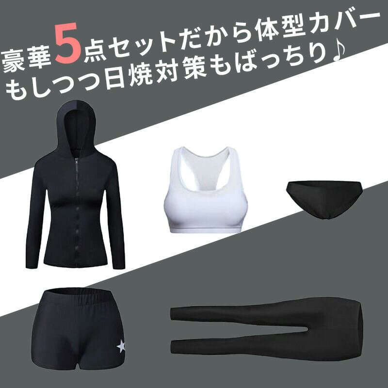 ラッシュガード、ブラトップス、 ショーツ、パンツ, レギンスの5点セット だからこれだけでOK! シーンに合わせて着合わせを変えて 対応することが出来ます! 今季トレンドのスポーティーデザインで、 スイムウェアとしてだけでなく、 ランニングやジムなど スポーツウェアとしても使える♪ 紫外線対策としてだけでなく、 露出を抑えて体型カバーしたい方にも 大注目のラッシュガード。 フィットネス水着なので ボディラインが出る作りですが、 体型カバーメインに着たい方は ワンサイズ上をおすすめします。 スポーティーラインとスターデザインで 引き締め見た目効果抜群です♪ ブラトップはパッド内蔵、 取り外し、追加も可能、 ワイヤー無しなので、 遊泳中のあの刺さってくる チクチクもありません♪ お得価格で1セットあれば、 水着以外にも使えてオールシーズン、 あなたのスポーツ、レジャーライフを 可愛くサポートしてくれます! ポリエステルメイン サイズ詳細は画像参照 伸縮性 透け感無し M L XL展開