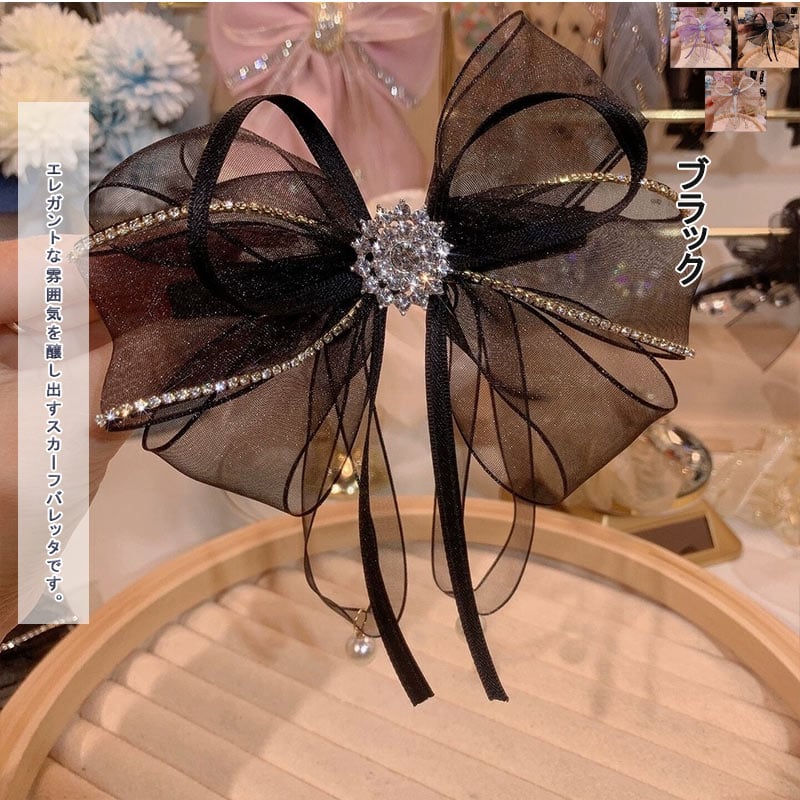バレッタ リボン ラインストーン 大きめ キラキラ ヘアアクセ ヘアピン ボリューム ヘアアレンジ ヘアアクセサリー レース 透け感 無地 まとめ髪 蝶結び 大人っぽい 女性 婦人用 キッズ 光沢 エ