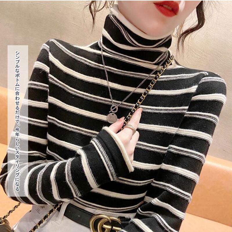 ヒットテーク タートルネック ハイネック タートル ボーダー ニット カットソー インナー 重ね着 裏起毛 トップス 長袖 セーター レディース 大きめ キレイめ 上品 シンプル 部屋着 ルームウェア