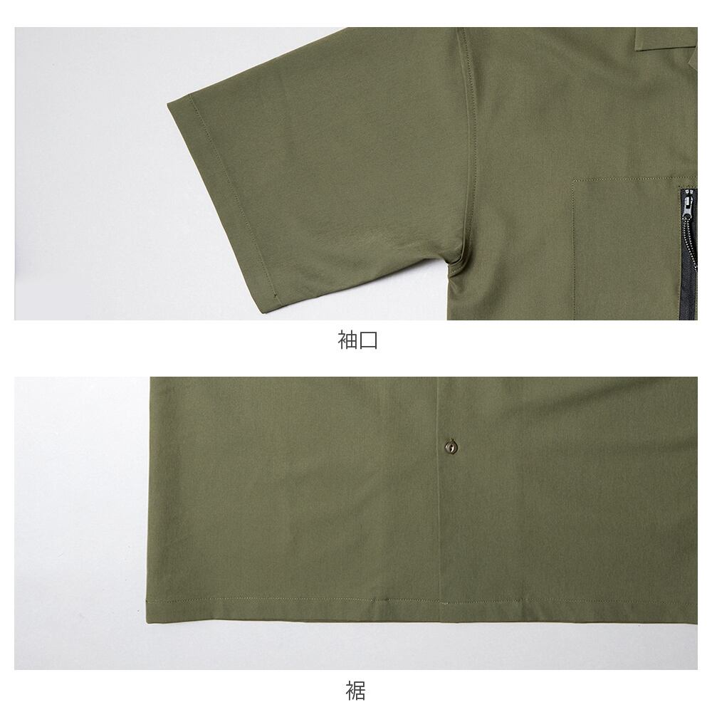 変形フラップと縦ジップデザインのポケットが付いたオープンカラーシャツ。