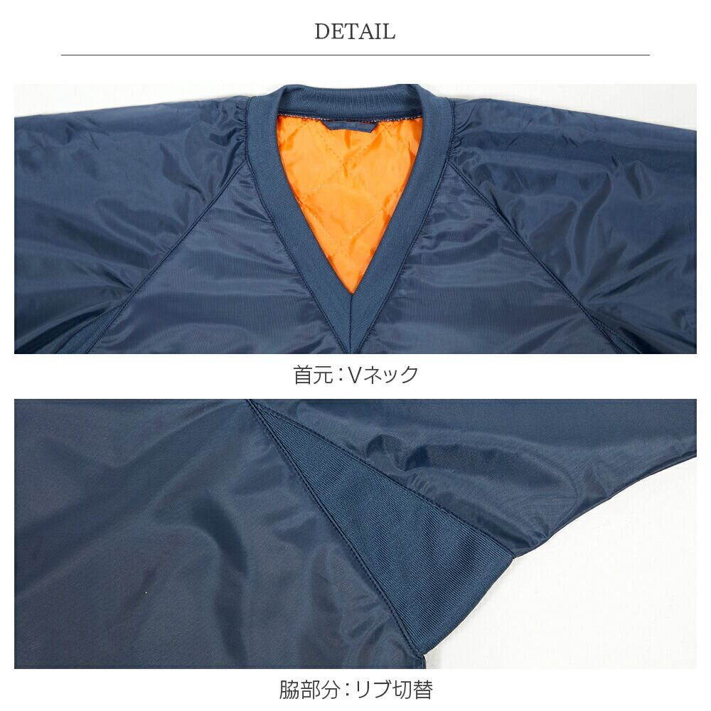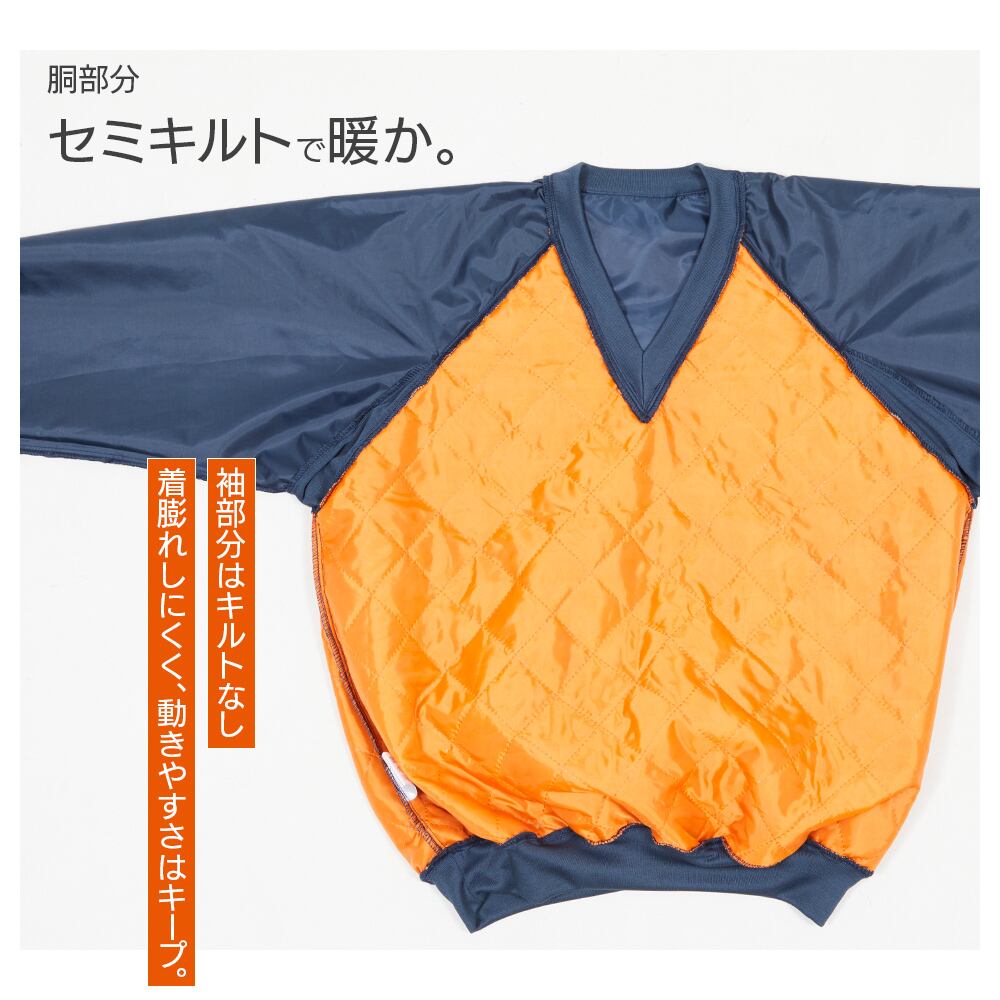 身頃部分のみキルト裏地を配置した保温性のあるVネックヤッケ。