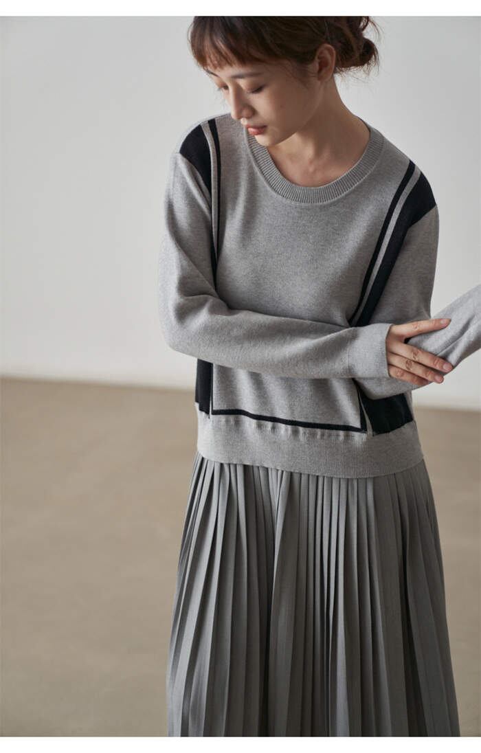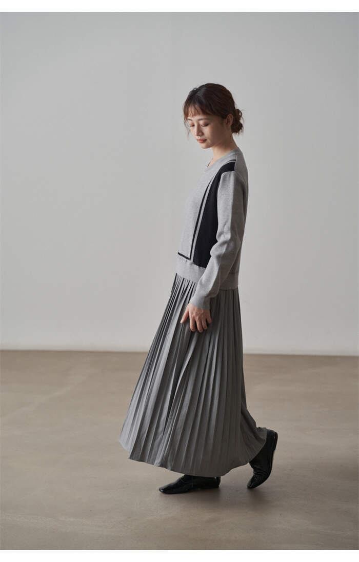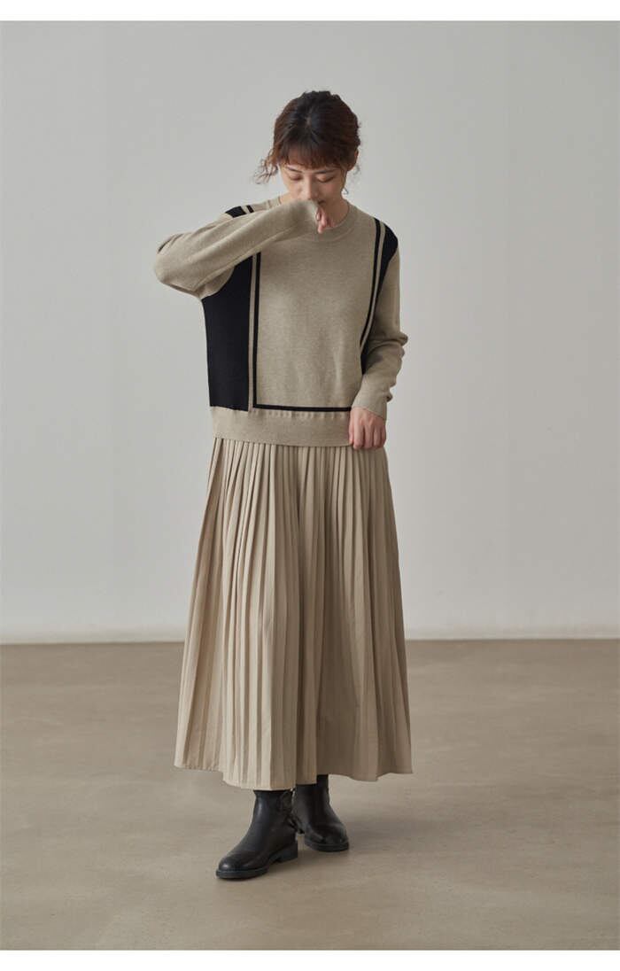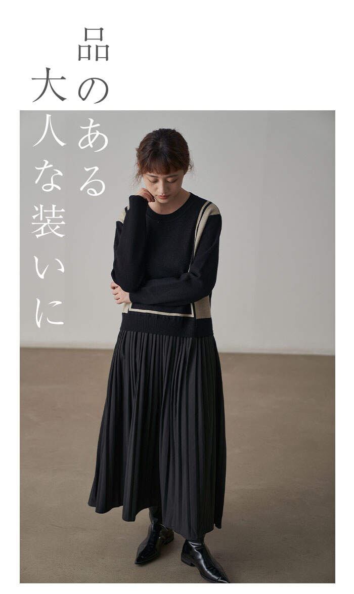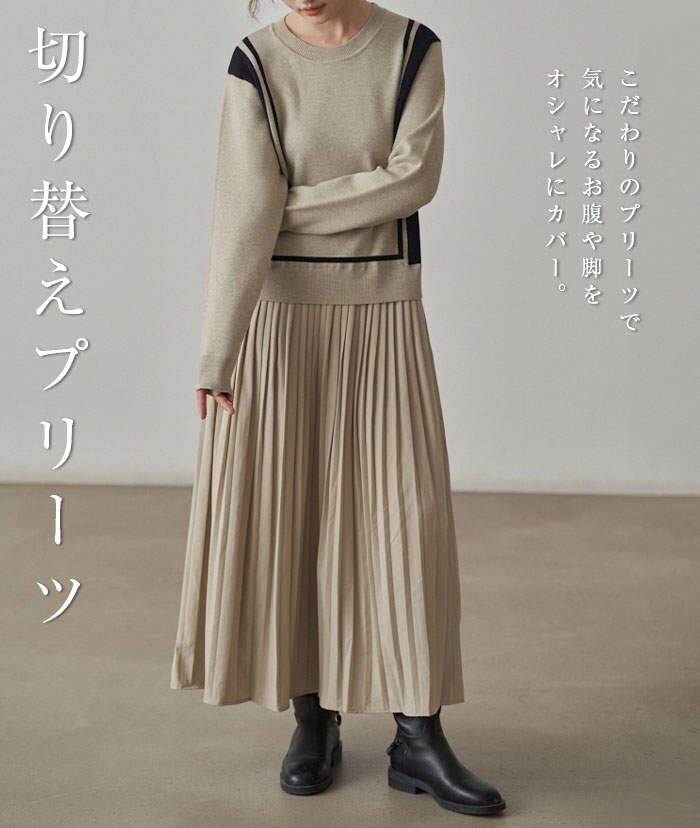 ワンピース ニット レディース プリーツワンピース カジュアル クルーネック ロング ドレス ロングワンピ マキシ マキシワンピ 配色 切り替え ワンピ 長袖 体型カバー 春 秋 冬 着痩せ きれいめ