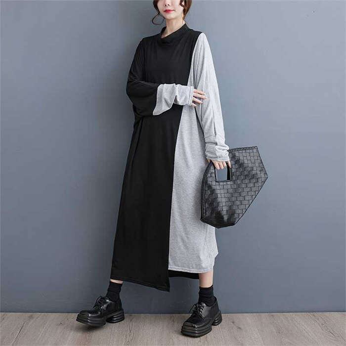 品よく女性らしい配色ロングワンピ♪ ただ着るだけでゆったりとラフでモードな雰囲気漂う、コーデに迷わないお洒落ワンピ