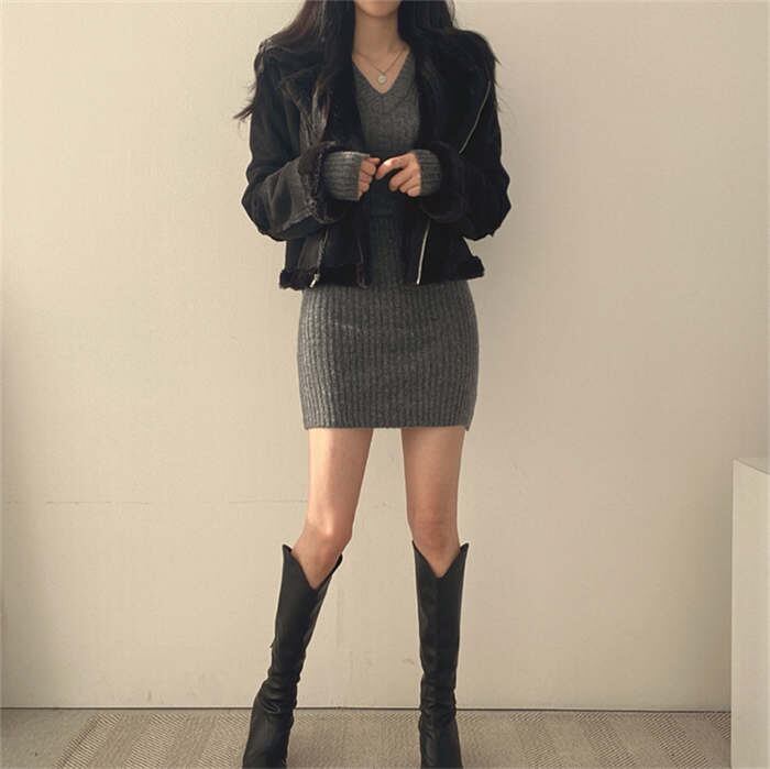 ニットワンピース タイトワンピース 姫系ワンピース 無地 秋 冬 Vネック 新作 ワンピース ニット タイト ショート丈 チュニック カットソー パーティー お嬢様 セクシー リブ きれいめ 長袖 O