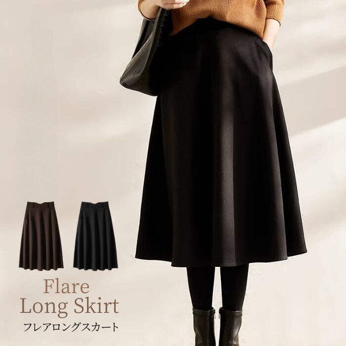 スカート ロングスカート レディース フレアスカート 無地 ハイウエスト 上品 シンプル きれいめ 大人 Aライン フレア 秋冬 ロング丈 ボトムス ゆったり ポケット 可愛い カジュアル ベーシック