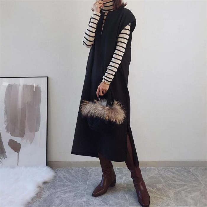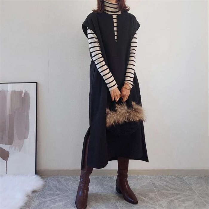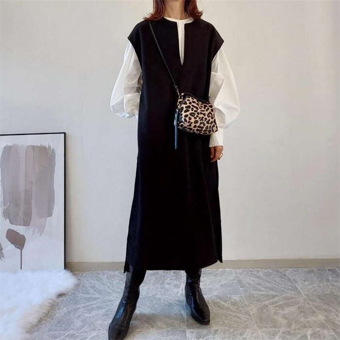 Vest One-piece レイヤードを楽しむ フレンチスリーブ ロング丈ワンピース 20代 30代 40代 50代 黒 ブラック M.L ♪