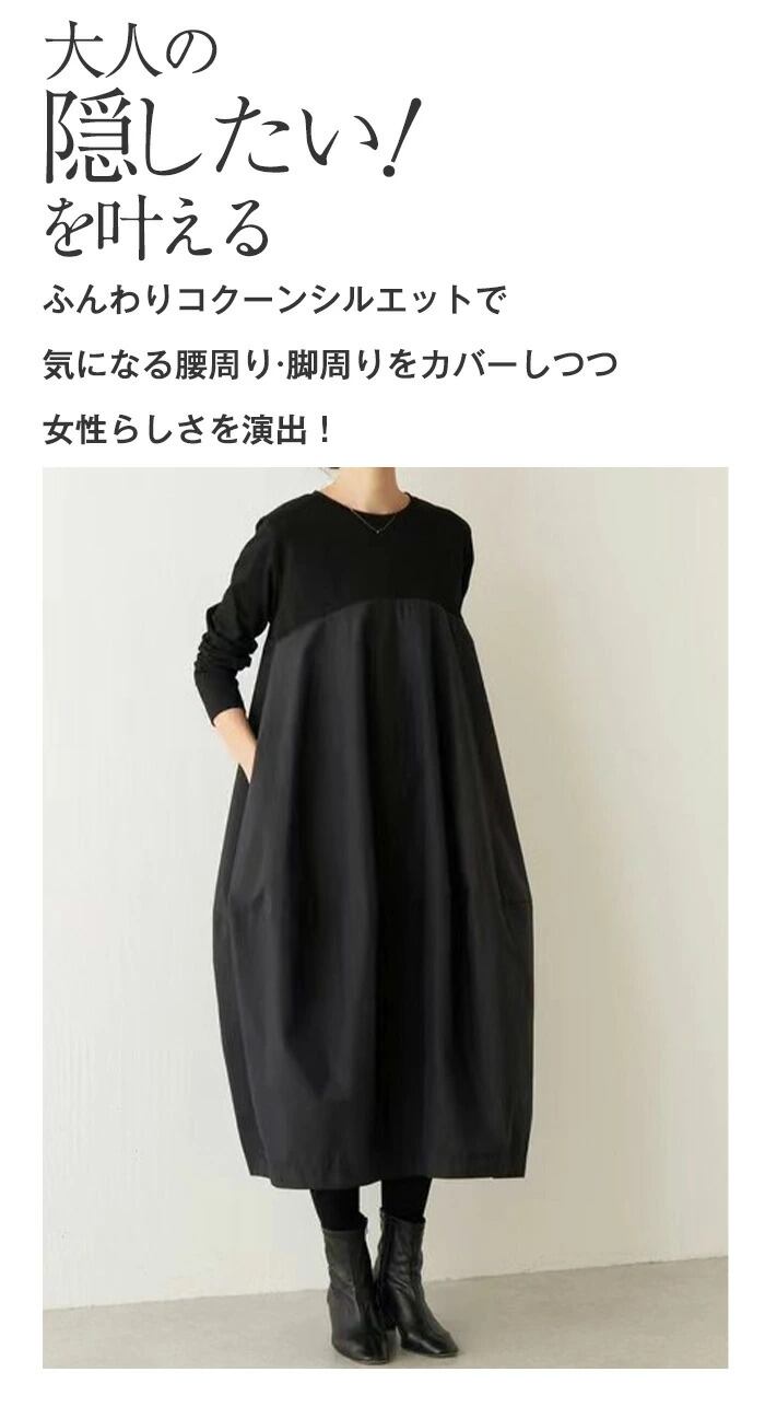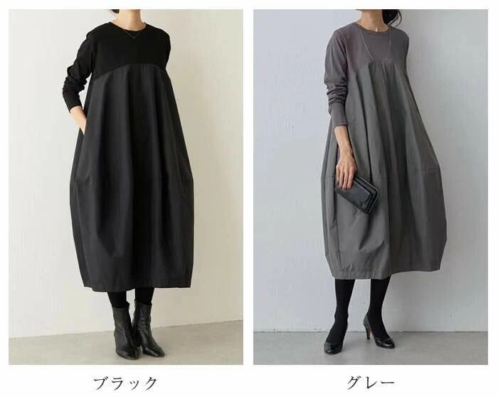 キーワード ワンピース 秋 春 夏 きれいめ 長袖 ロングワンピース 切り替えワンピース カジュアル かわいい 大人 ロング丈 マキシ丈 リラックス コクーンスカート 無地 大きめ 大きいサイズ 着痩せ おしゃれ 体型カバー 体型隠し リゾート シンプル