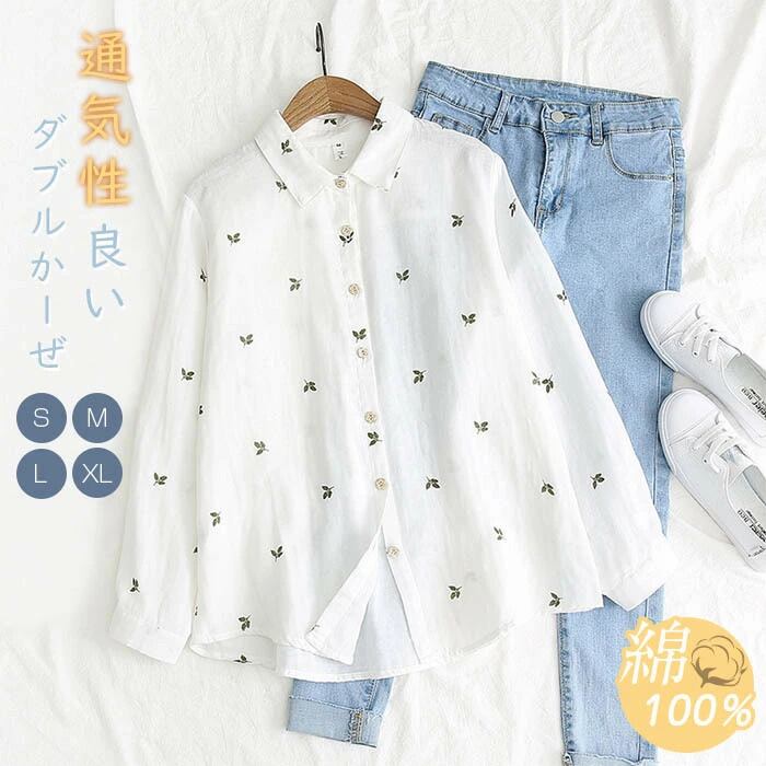 キーワード シャツ レディース 長袖 お洒落 綿100% 春 ブラウス トップス ダブルガーゼシャツ 総柄 オフィス ワイシャツ ゆったり ダブルガーゼ ガーゼ 折り襟 コットン シンプル カジュアル コーデ 形態安定 大きいサイズ オフィス フォーマル