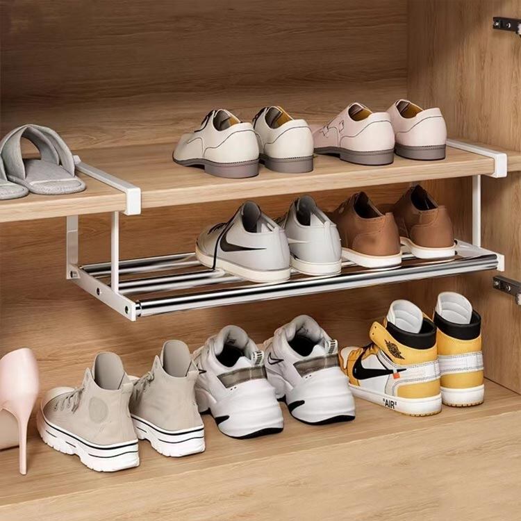 下駄箱やシューズクロークの棚下に差し込むだけで、靴箱下の空間を有効活用できる伸縮シューズラック。横幅は約48〜80cmの間で自由に伸縮でき、設置場所に合わせて使えます。