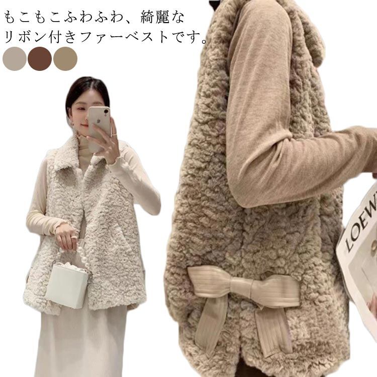 サイドリボン ファーベスト ショート丈 ベスト ジレ レディース 前開き ノーカラーレディースファッション コート ジャケット