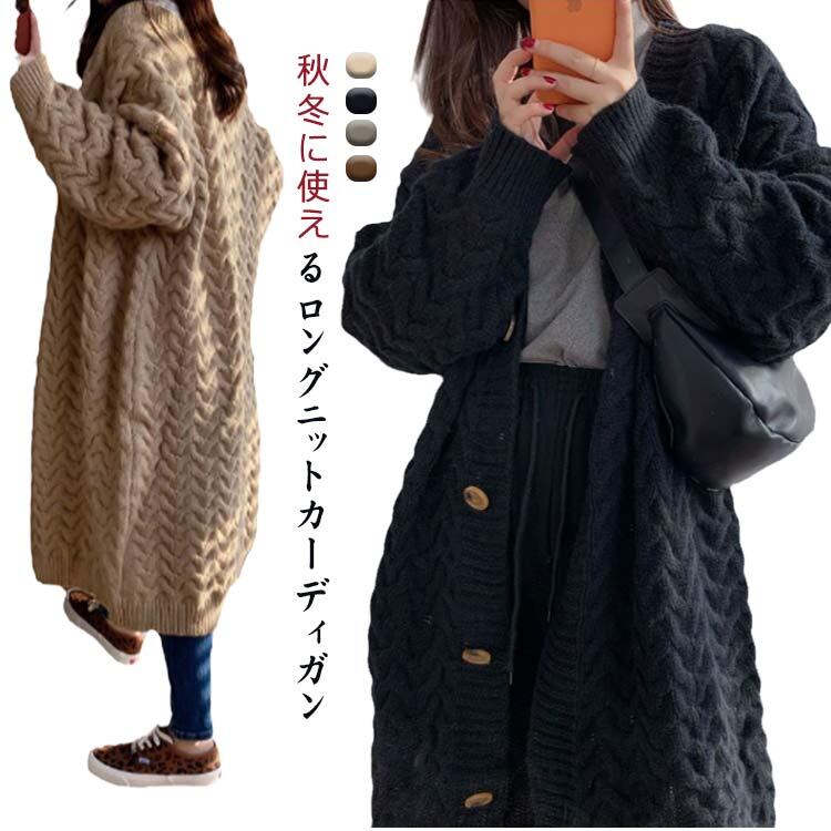 カーディガン レディース 長袖 ニット アウター 厚手 ロング丈カーディガン ざっくり ケーブル編み
