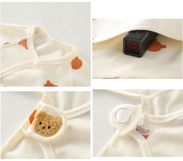 【科学的なデザイン】上下がつながっているので、赤ちゃんが動いてもおなかが出る心配はありません。胸元はベルクロ仕様で着心地がよく、着脱も簡単。股の部分はスナップボタンデザインですので、通気性も優れていて、おむつ替えも簡単で済ませます。