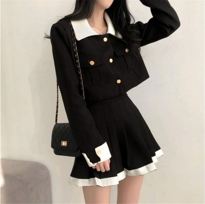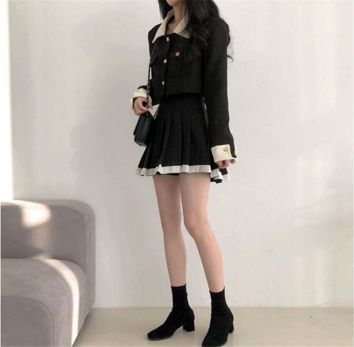 ツイードカラーネックジャケット&スカート セットアップ 韓国ファッション ミニ丈 プリーツ ハイウエスト