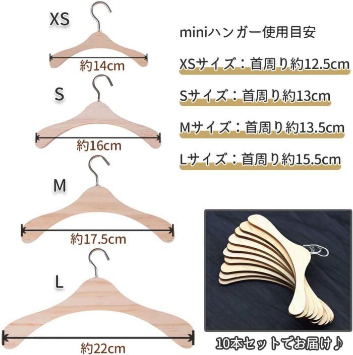 洋服を傷めにくい優しい素材と丸みをおびたデザイン、長期間使用しても変形しにくい仕様です。素材 木製/金属カラー 写真通りサイズ サイズ:【XS】幅14cm【S】幅16cm【M】幅17.5cm【L】幅22cm 使用目安:【XS】首回り12.5cm【S】首回り13cm【M】首回り13.5cm【L】首回り15.5cmセット内容 ペットハンガー10本原産国 中国