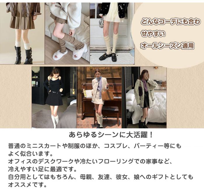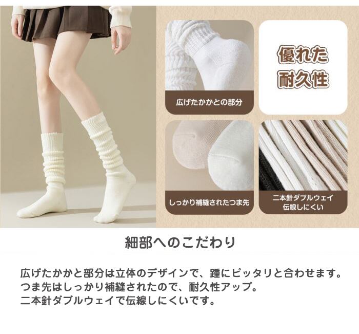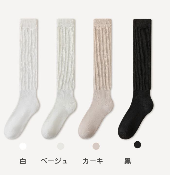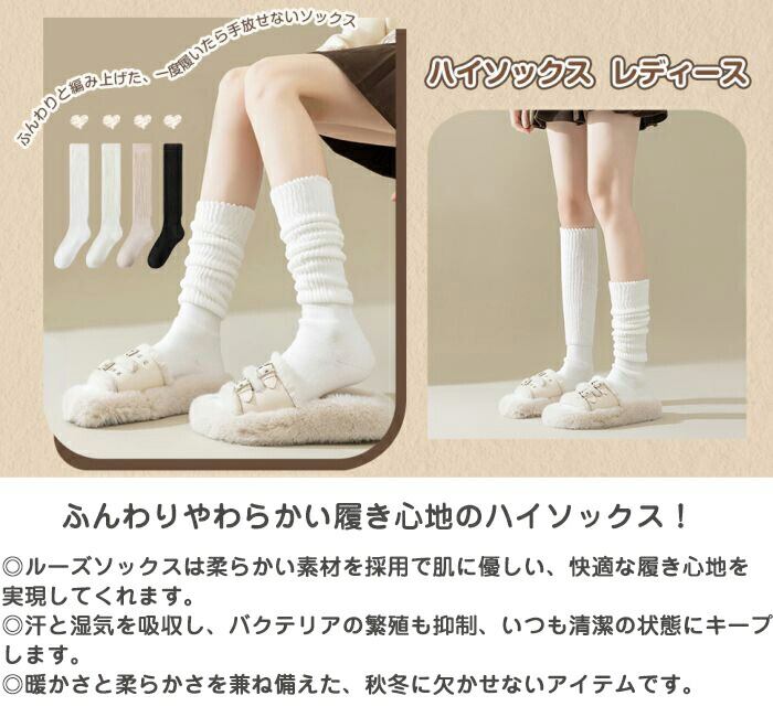 【2way履き方】01.グイ-ンと伸ばしてひざ下丈くらい膝下まで暖めます。02.足首あたりでくしゅくしゅルーズに履いてもOK。シンプルなデザインで、どんな服装にも合わせやすく、ファッショナブルな雰囲気を演出できます。自分のニーズに合わせて、ルーズソックスとハイソックスを自由に切り替えることができます。