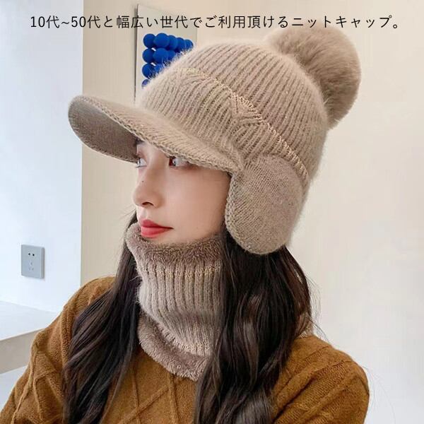 帽子 レディース 秋冬 裏起毛 2点セット 6color あったか ニット帽 レディース つば付き 防寒 暖かい 耳あて付き 帽子 ネックウォーマー 可愛い おしゃれ 秋 冬 帽子 リブ編み ポンポン付き 大きめ ニットキャップ 保温 かわいい