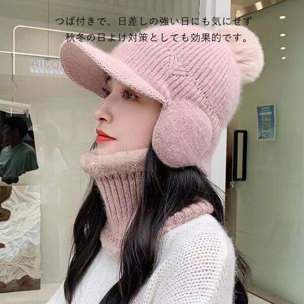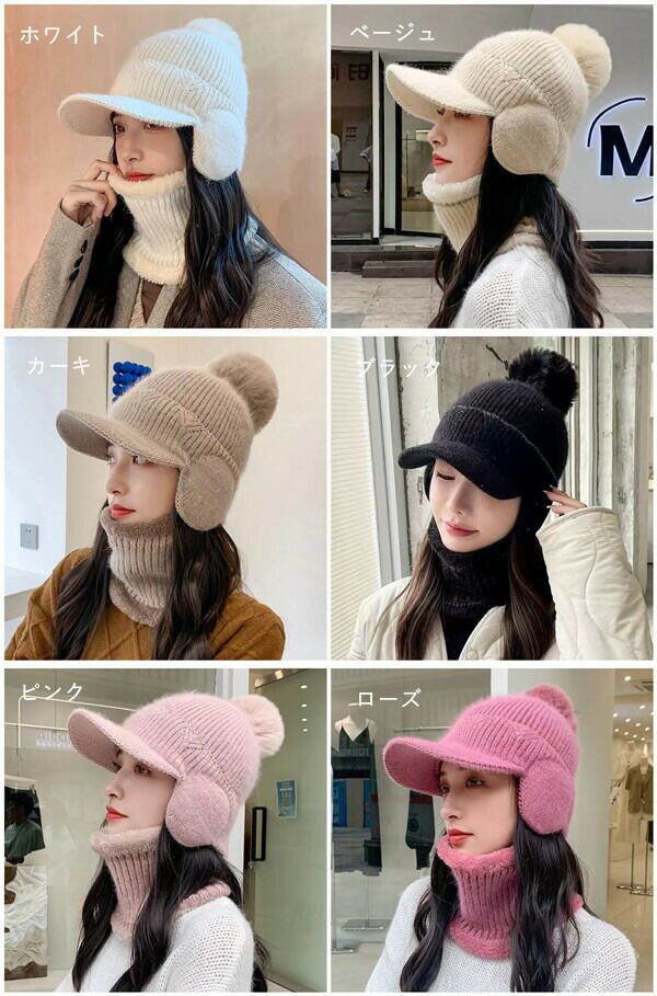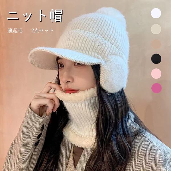 帽子 レディース 秋冬 裏起毛 2点セット 6color あったか ニット帽 レディース つば付き 防寒 暖かい 耳あて付き 帽子 ネックウォーマー 可愛い