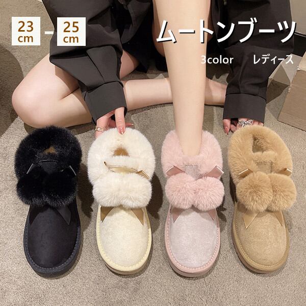 ムートンブーツ レディース 可愛い 4color ショートブーツ ポンポン付き 厚底 スノーブーツ おしゃれ ショートムートン レディース ファームートン 内ボア あったか 23-25cm